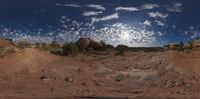 a 360 - view of a dirt road surrounded by mountains with sun shining in the distance