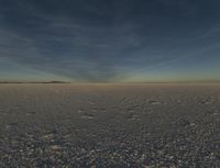 This is an image of the calm and serene natural environment in Utah during dawn. The landscape consists of sandy desert with mountains in the background. The reflection of the sky on the surface of the water creates a beautiful calm atmosphere. Above, the clouds and contrails streak across the blue sky. In the distance, the horizon meets the salt lake, adding to the emotional appeal of the scene. This photo depicts the unique and breathtaking beauty of Utah's natural surroundings.