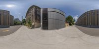 A 360-lens photograph captures the urban design of a Toronto neighborhood. Modern architecture mixes with classic buildings, creating a symmetrical cityscape. The lack of sidewalks enhances the open and spacious feel of this metropolitan area.