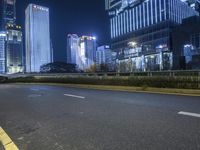 This is an image of a modern cityscape at night. The futuristic architecture and skyscrapers create a stunning metropolitan scene. The city lights and street lamps illuminate the roads and lanes, creating a beautiful contrast against the clear night sky. The office buildings in the business district stand tall and sleek, representing the urban infrastructure. Neon lights add vibrant pops of color to the dark surroundings. This photo captures the essence of a bustling metropolis and showcases the modern architecture and urban life.