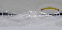 an underground parking lot with snow and neon lights on the ceiling and a walkway that leads to the parking garage area