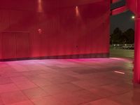 A futuristic architecture in Los Angeles, California. The neon lights illuminate the city at dawn, creating a vibrant atmosphere. The urban open space features a courtyard with a red floor and wooden walls. A perfect blend of art and modernity.
