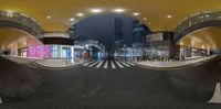 A futuristic architecture in Guangzhou, China. The curved walkway with a sky bar in the middle resembles a train station. The urban landscape is illuminated by neon lights, creating a vibrant cityscape.