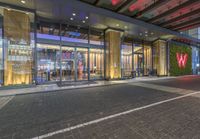 A modern office building in Taipei, Taiwan, illuminated by neon lights at night. The glass facade reflects the city lights, showcasing the vibrant urban design. The cobblestone road surface adds to the charm of this bustling city.