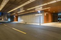 a empty empty street under an overpass at night, near a city building and lamp posts