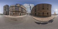 Aerial view of a modern architectural building in the heart of a bustling city in the Netherlands. The building's unique fish-eye shape stands out against the classic architecture of its neighboring buildings. City life at its finest.