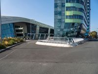 This photo showcases a modern architecture in the business district of a bustling city in Europe, specifically in Holland, Netherlands. The image features a large, curved building with a pedestrian foot bridge passing through it. On both sides of the foot bridge, there are lush bushes and vegetation, adding a touch of green to the urban landscape. The city's skyline is dominated by tall skyscrapers and high-rise buildings, reflecting the urban design of the area. This image captures the essence of city life and the blend of nature and architecture in a vibrant European city.