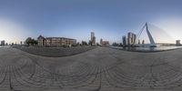 A stunning view of a cityscape in the Netherlands at sunrise. The fisheye lens captures the beautiful architecture, reflecting in the water. The bridge in the distance adds to the urban charm.