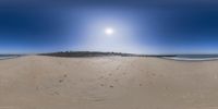 a panoramic view of the beach in a clear sky with footprints, a bird and some other feet in the sand