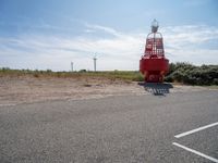 This is an image of a road in the Netherlands, with a red and white lighthouse on the side. The road surface is made of asphalt, and there is grass in front of the lighthouse. The clear sky in the background enhances the landscape and horizon. This photo depicts a typical day in Holland, with a wind turbine and windmill visible in the distance. The image captures the beauty of the Dutch countryside, showcasing the unique blend of nature and man-made structures that can be found throughout Europe.