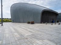 A modern gray building with a unique facade and urban design in Holland. The empty brick patio is surrounded by lush plants and trees, with a blue umbrella providing shade on a sunny day.