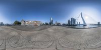 Circular panorama photo taken in the Netherlands, capturing large buildings on the riverfront. The bridge in the distance leads to a modern architectural marvel. The cityscape is illuminated by artificial light, creating a vibrant atmosphere.