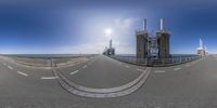 a wide panorama photo taken on a road near a power station and bridge overlooking the ocean