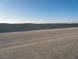 A road stretches through the picturesque landscape of the Netherlands, with sand dunes on one side and a clear blue sky above. The cars on the road add a touch of movement to the serene scene.