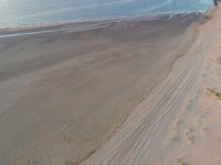 This is an aerial view of the coastal landscape in Holland, Netherlands. The image captures the breathtaking beauty of the open space, with the high dunes and sandy beaches stretching as far as the eye can see. The pattern of the sand dunes creates a stunning and unique terrain, forming Aeolian landforms. The break of day offers a serene atmosphere as the dawn light illuminates the beach and ocean. This photo showcases the natural beauty and elevated perspective of the Netherlands' coastal region.