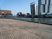 This is an image of a modern cityscape in Holland, Netherlands. The architecture is a mix of high-rise buildings and condominiums, surrounded by open spaces and water. The city streets are lined with cobblestone and asphalt roads. The photo was taken at dawn, capturing the clear sky and the reflection of the buildings on the lake. This urban design showcases the combination of modern and traditional elements in the city. It represents the vibrant city life and urban atmosphere in Holland, a country known for its innovative urban planning.