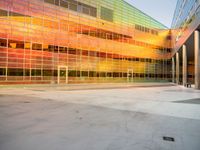 This is an image of a modern office building in Holland, Netherlands. The multicolored facade stands out against the clear sky. The surface of the building is made of concrete and brick, showcasing modern architecture and urban design. The building is located in a business district, surrounded by other office buildings and a stadium in the distance. The open space around the building provides a public space for people to enjoy. This photo captures the essence of modern architecture and the vibrant business atmosphere in Holland.
