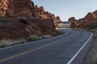 Road trip through the desert badlands of Nevada. The asphalt highway curves through the iconic red rock formations of the southwest. Clear skies showcase the stunning mountain landscapes and unique geology of this national park.