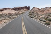 This is an image of an empty road in the desert area of Moab, Nevada, USA. The straight road stretches through the rocky mountain peaks and is surrounded by bushes. The landscape features the unique geology of the southwest, with red rock formations on the horizon. The clear sky above adds to the serene atmosphere of the scene. This photo captures the vastness and beauty of the Nevada desert, showcasing the natural wonders of the region.