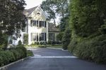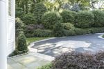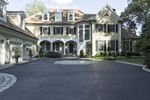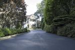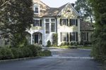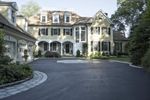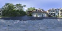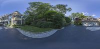 Upside-down fisheye view of a residential area in New Canaan, Connecticut. The map-like landscape showcases a neighborhood with beautiful homes, driveways, and lush vegetation. Straight roads lead to open spaces and tree-lined walkways. A unique perspective on suburban living in the USA.