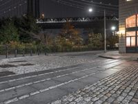 A nighttime view of the classic architecture in Manhattan, New York. City streets lined with cobblestone and street lights create an art district vibe. The cityscape against the dark sky is a perfect backdrop for this urban scene.