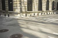 A high view of a classic architecture office building in Manhattan, New York. The urban landscape showcases the patterned road surface and the reflection of the building on the asphalt. A bustling business district with elevated roads and high-rise buildings.