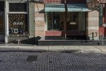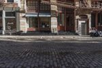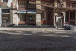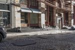 A picturesque view of three side-by-side buildings with windows in a big brick city square in New York City. The classic architecture and cobblestone street create a charming urban scene.