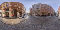 three buildings with windows in a big brick city square, both side by side on a street