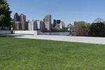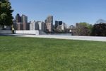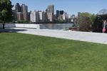 A clear day in New York City with a stunning view of the cityscape and skyline. The reflection in a spherical lens captures the urban park with lush green grass, trees, and walkways.