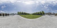 a reflection in a spherical lens shows a park and a green field with trees near the road