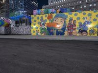 A dark night in Manhattan, with a street lined with impressive graffiti art. City lights illuminate the urban landscape, creating a vibrant cityscape. A popular tourist spot in New York City.
