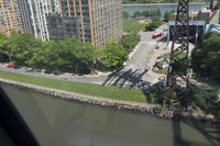 Aerial view of New York City's vibrant cityscape with its iconic skyline. The high-rise buildings and residential areas contrast with the green vegetation. The city is bordered by a river and features a bustling harbor and piers.