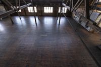 A high-rise structure in the heart of New York City. The concrete walls and floors are illuminated by the natural light, creating a reflection on the wood flooring. The urban scene features a brick wall and open space.