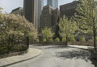 A view of the iconic New York City skyline, with the towering skyscrapers of Manhattan dominating the cityscape. The urban metropolis is surrounded by a mix of suburban and residential areas, lined with roads and trees.