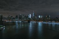 This is an image of the New York City skyline at night. The high-rise buildings and skyscrapers create a stunning cityscape, illuminated by artificial lights. The city overlooks the river, with the water reflecting the lights and adding to the beautiful view. This metropolitan area represents the bustling urban life of New York, with its vibrant nightlife and iconic landmarks. The dark sky and clouds serve as a dramatic backdrop for the city lights. This photo captures the essence of Manhattan, one of the most famous boroughs in New York City.