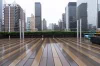 A view of the New York City skyline with towering skyscrapers and urban architecture. The city is bustling with activity as people walk along the busy streets and open spaces. The low clouds and wet road surface reflect the vibrant city lights, creating a captivating atmosphere. This image showcases the modern and iconic buildings, showcasing the metropolitan area's architectural beauty. The wood floor of the deck and walkway adds a touch of warmth and elegance to the cityscape.