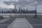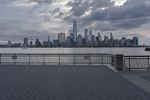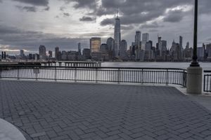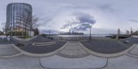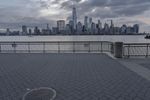 A distorted fish-eye lens view of New York City's skyline. The modern architecture and skyscrapers create a stunning cityscape against the grey sky. The metropolitan area is surrounded by coastal waters, with a downtown pier and skatepark in the foreground.