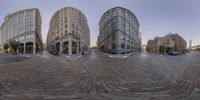 A panoramic view of a street scene in downtown New York City. Classic architecture and a clear sky create a picturesque backdrop. The intersection of two buildings is captured through three fisheye lens pictures, showcasing the unique urban landscape.