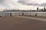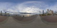an fisheye lens is on a street view near the ocean and city skylines