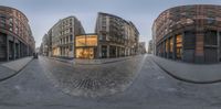 A vibrant cityscape in the heart of Manhattan, New York. Classic architecture and cobblestone streets set the scene for a bustling business district. Office buildings and storefronts glow with artificial light, creating a captivating urban atmosphere.