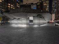 Nighttime in New York City showcases its iconic modern architecture. The illuminated concrete structures and open plazas create a vibrant urban atmosphere. Light streaks and reflections on the asphalt roads add to the dynamic energy of the metropolitan area.