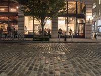 A view of a classic architecture storefront in Manhattan, New York. The cobblestone road surface gives the urban street a charming look. The facade is beautifully lit with artificial lights, creating a warm and inviting atmosphere.