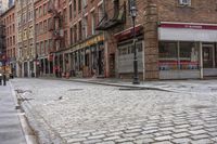 A gloomy day in Manhattan, New York. Classic architecture of residential buildings line the streets, with cobblestone roads and grey skies overhead. Explore the urban design, quaint restaurants, and bars in this vibrant city.