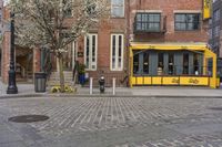A classic brownstone in Manhattan, New York. The yellow restaurant with a sidewalk awning adds vibrancy to the urban street. The building behind it showcases the charming architecture of the city.