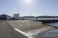 A sunny day in Wellington, New Zealand. The clear sky reflects on the coastal water. A dock with several poles and a building stands next to the picturesque body of water. The perfect spot for recreational activities.