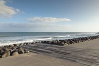 A beautiful coastal landscape in New Zealand at dawn. The sun rises over the ocean, casting a warm light on the sandy beach. The road surface leads to a wooden jetty, inviting visitors to explore the natural environment.
