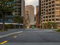 An empty road at dawn in Wellington, New Zealand's bustling business district. Large office buildings and storefronts line the street, illuminated by traffic lights. A busy intersection in the heart of Wellington's commercial hub.