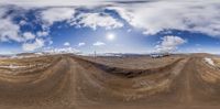 A wide angle view of a dirt track in New Zealand's extreme terrain. The partly cloudy sky adds drama to the landscape. The road leads straight to the mountain overlook, offering a breathtaking view. A perfect spot for recreational activities.