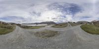 a long gravel road going down to a large body of water in the distance with some mountains in the background