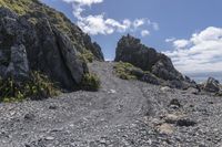 Rugged mountain landscape of the North Island, New Zealand. Steep slopes covered in grass and vegetation lead to a dirt track that winds through the highlands. Clouds adorn the rocky terrain.